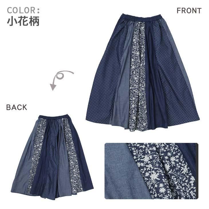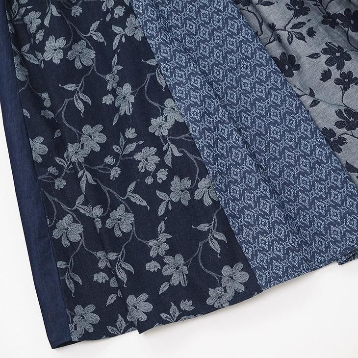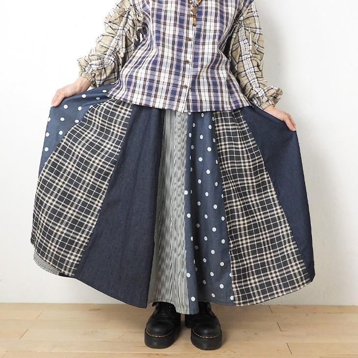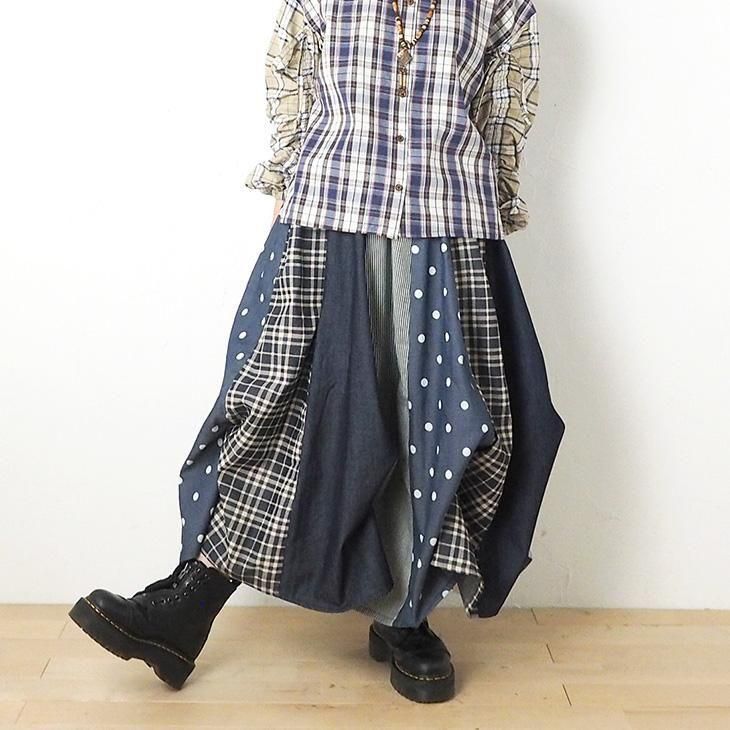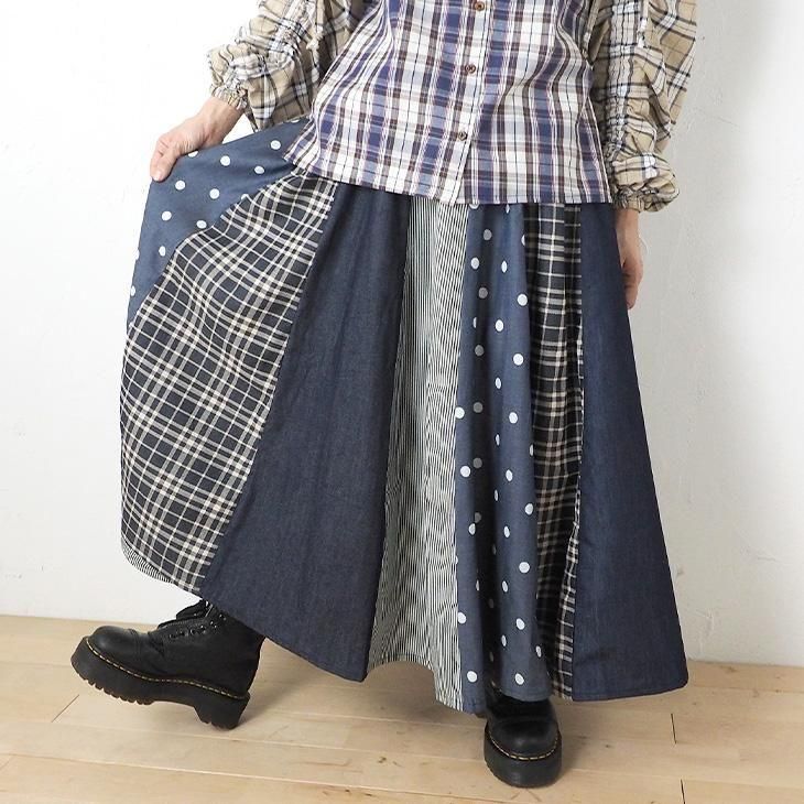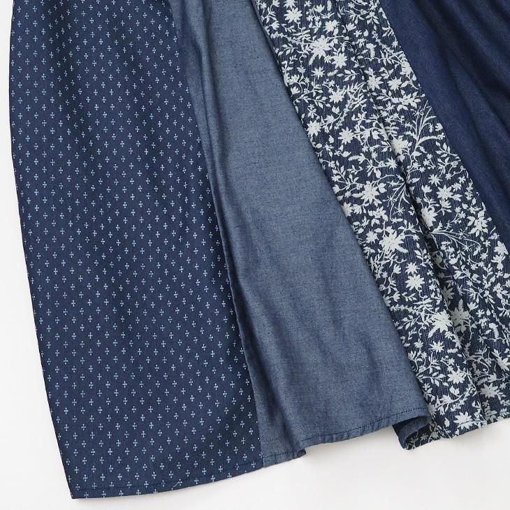 インドのデニムを組み合わせた縦の切り替えがかっこいいロングスカート。