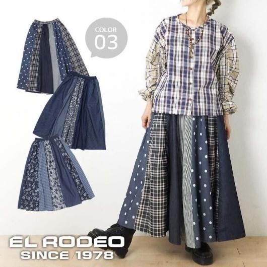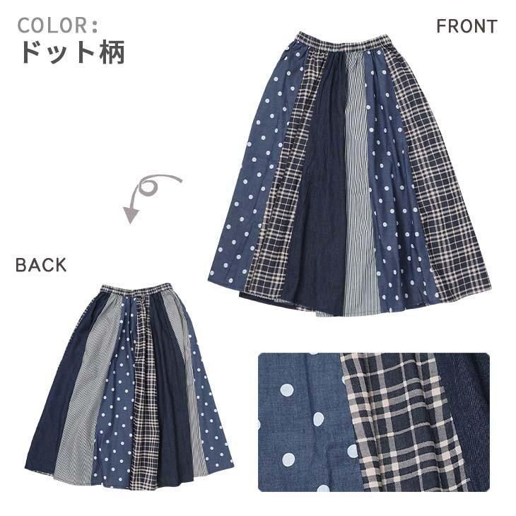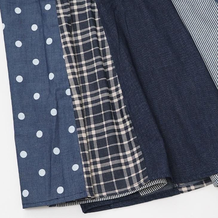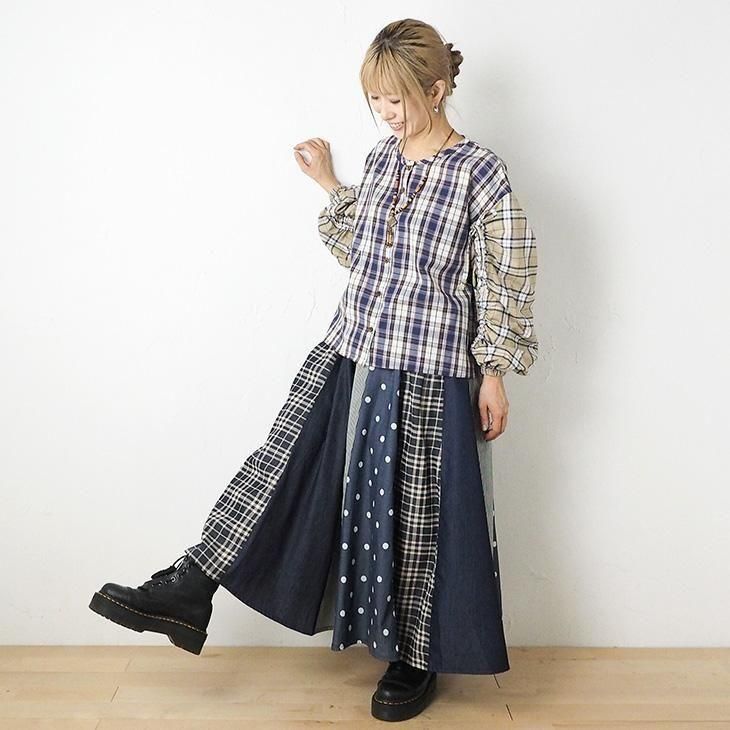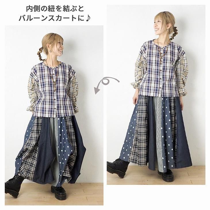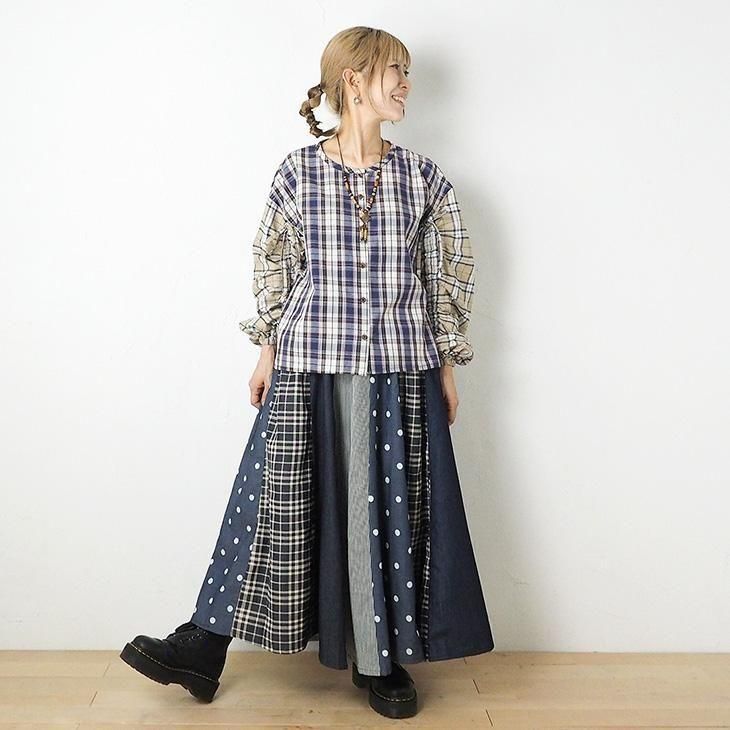 インドのデニムを組み合わせた縦の切り替えがかっこいいロングスカート。