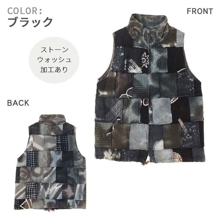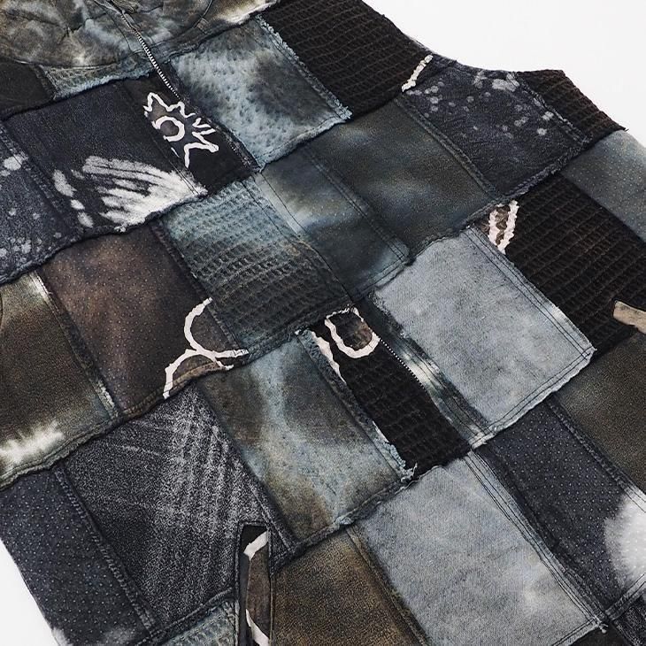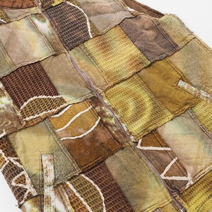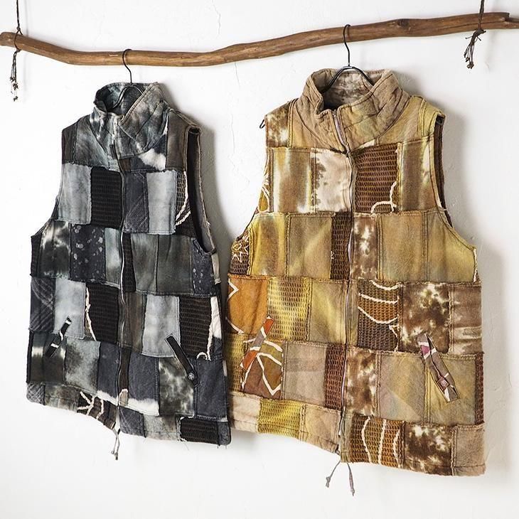 染め×異素材のパッチワークが特徴的なジップベスト。
