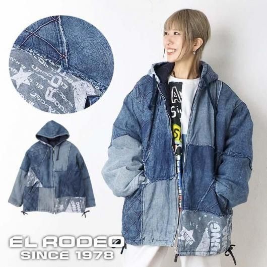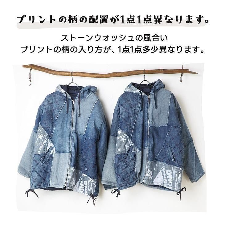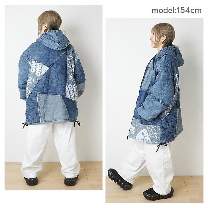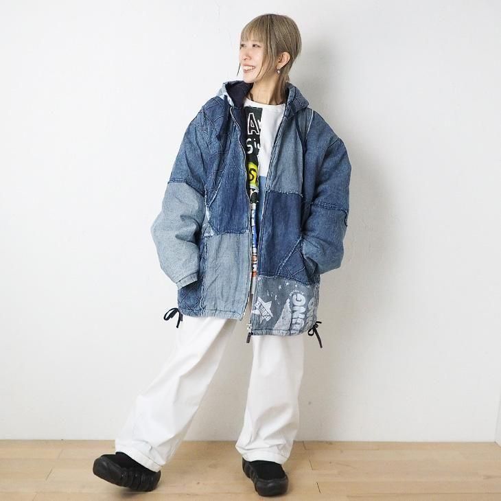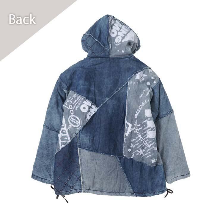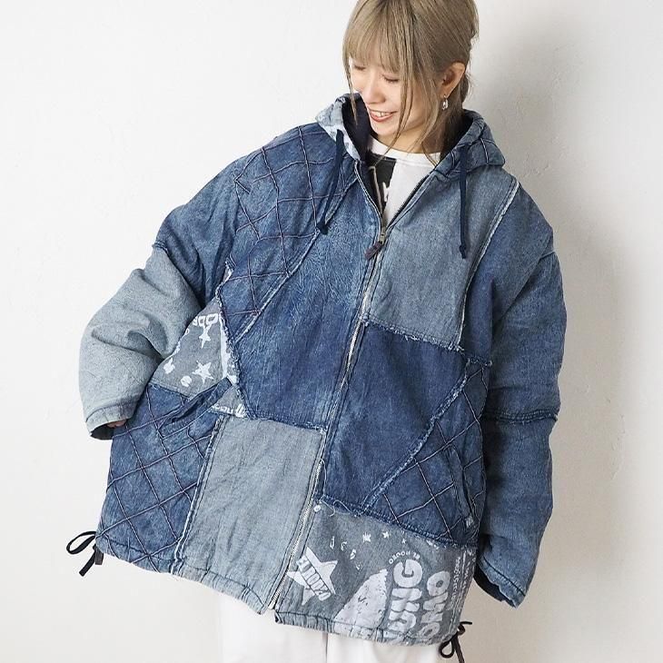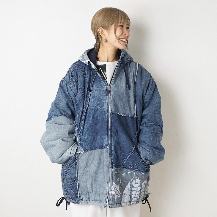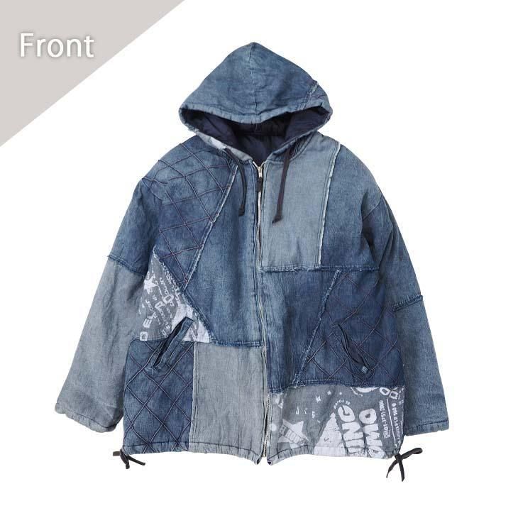 ランダムなデニムのパッチワークが特徴的な中綿パーカージャケット。