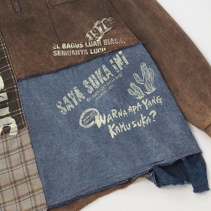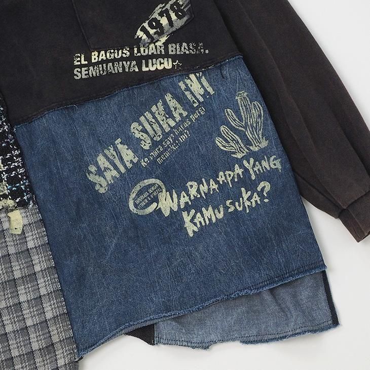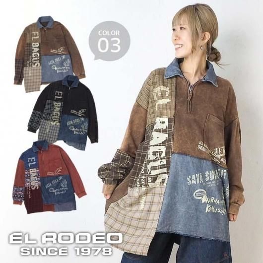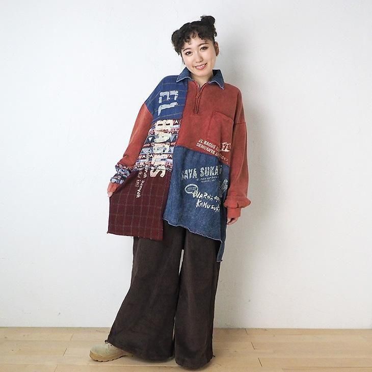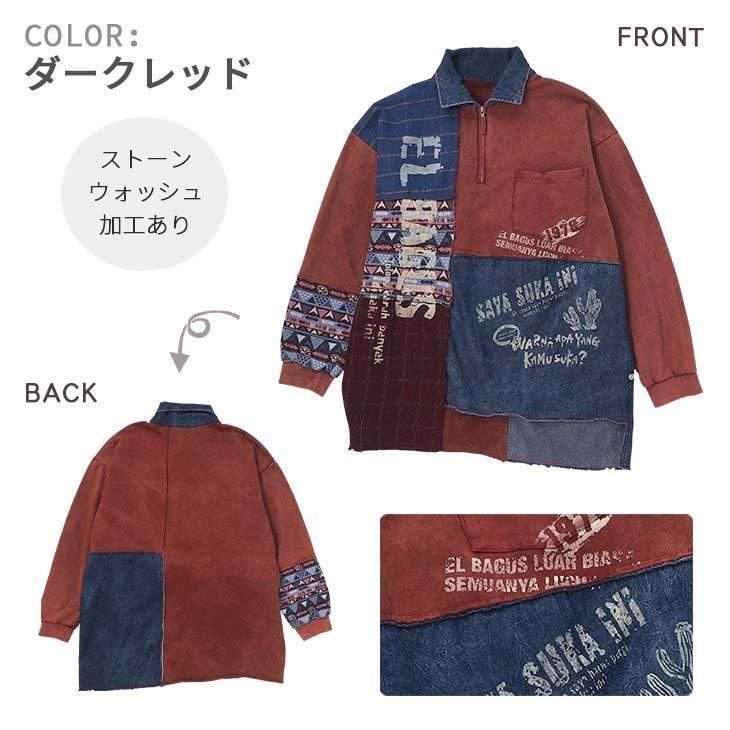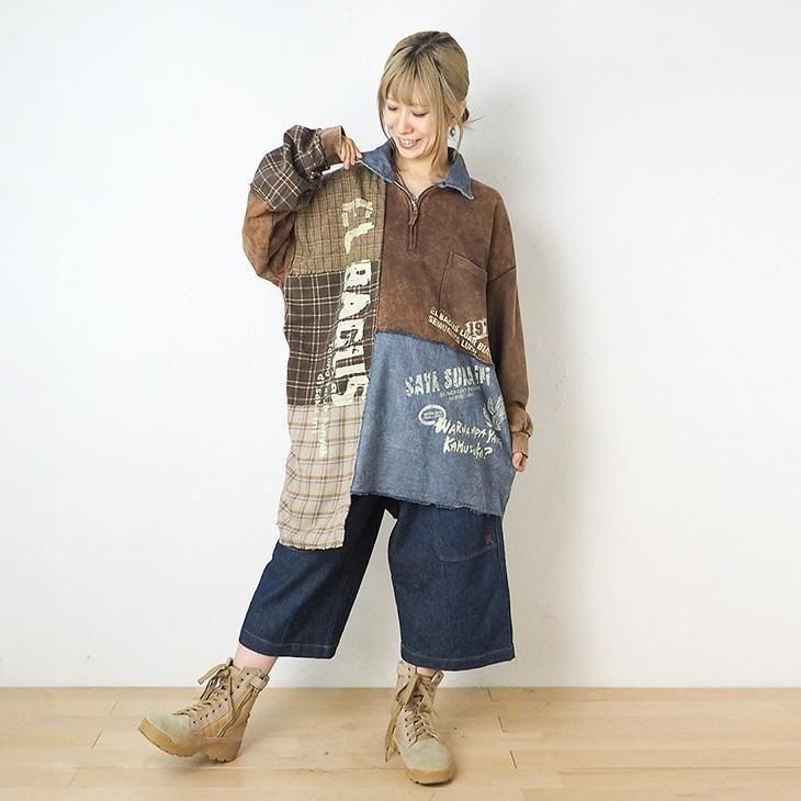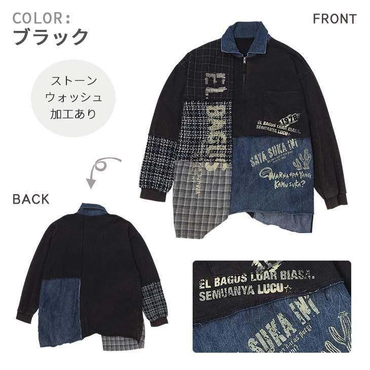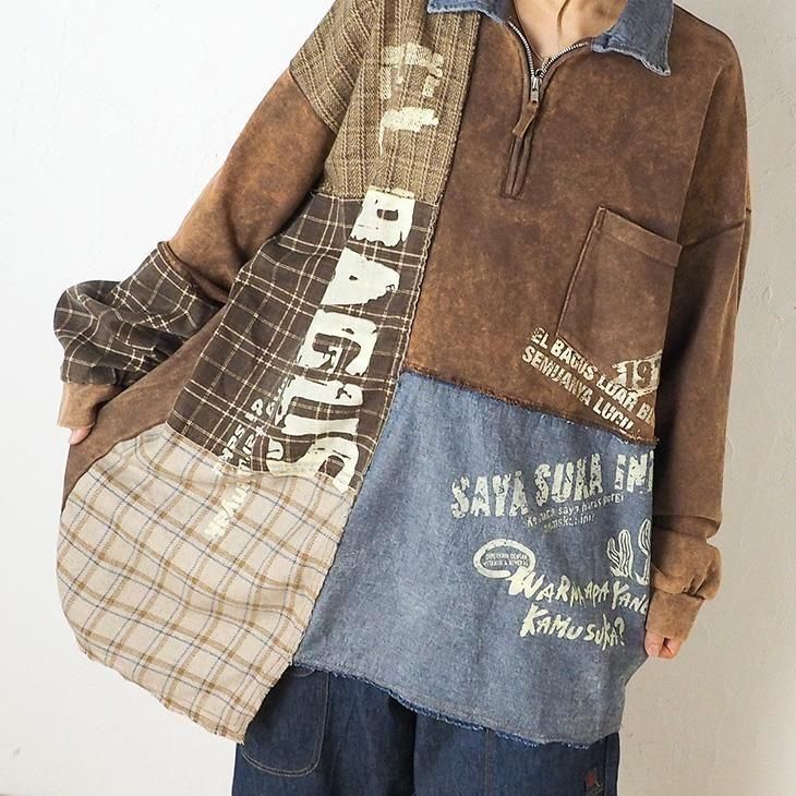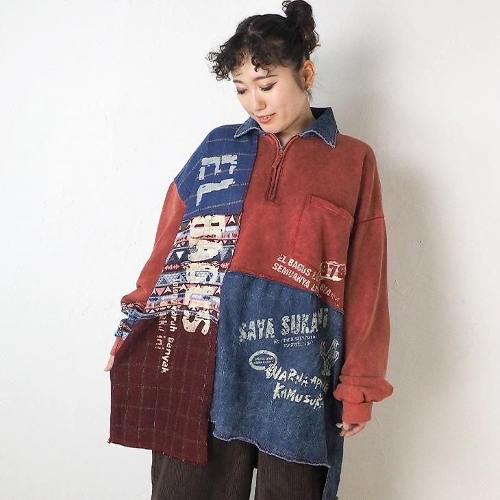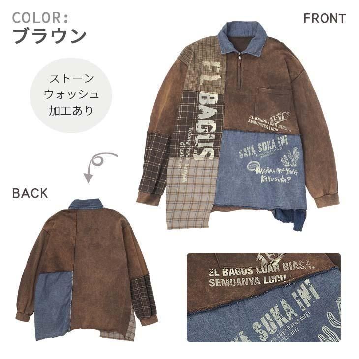リメイク風の切り替えがお洒落なハーフジップの襟付きトレーナー。