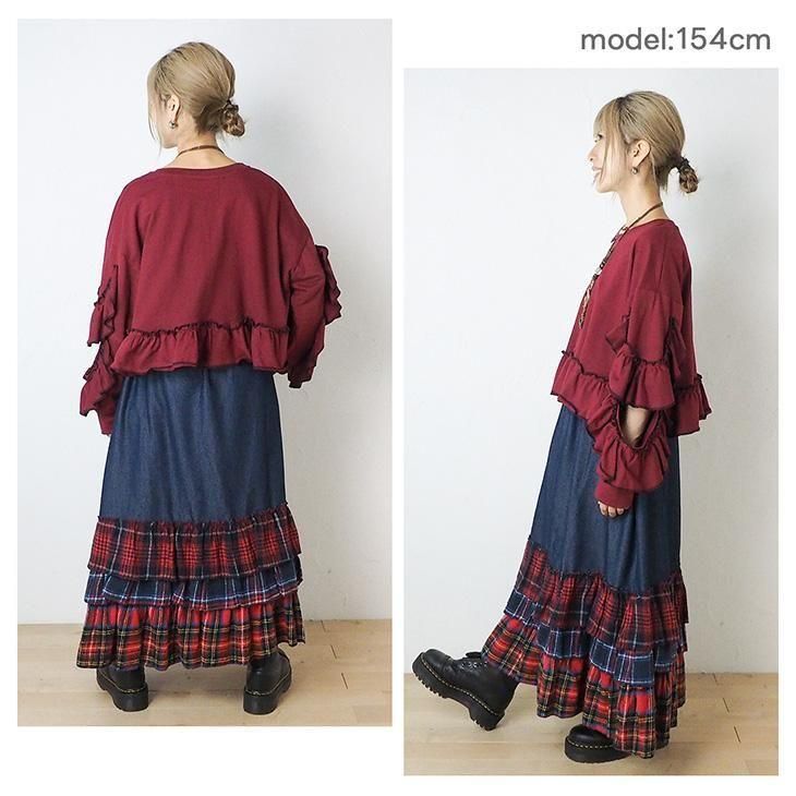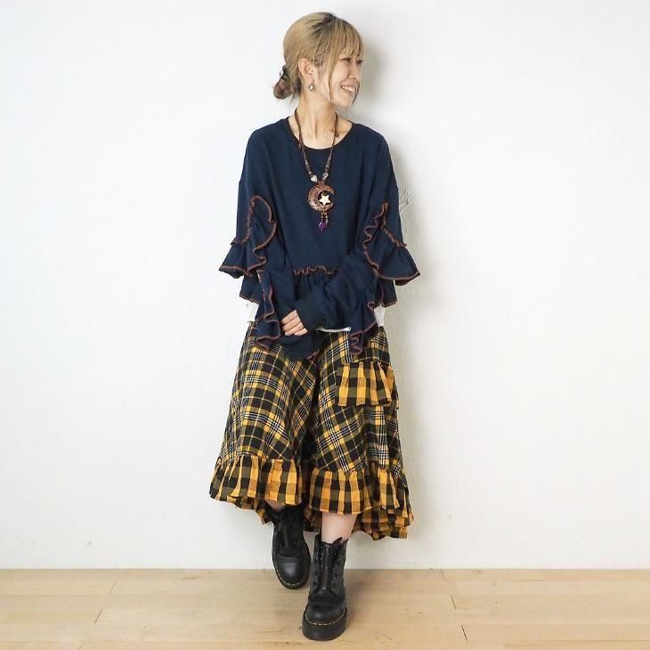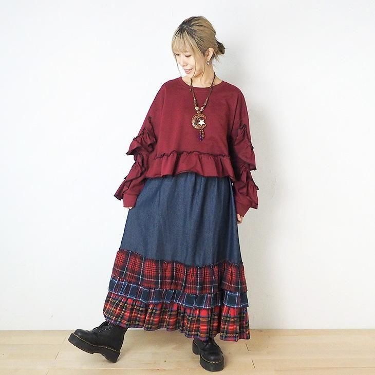 裾チェック柄フリルロングスカート