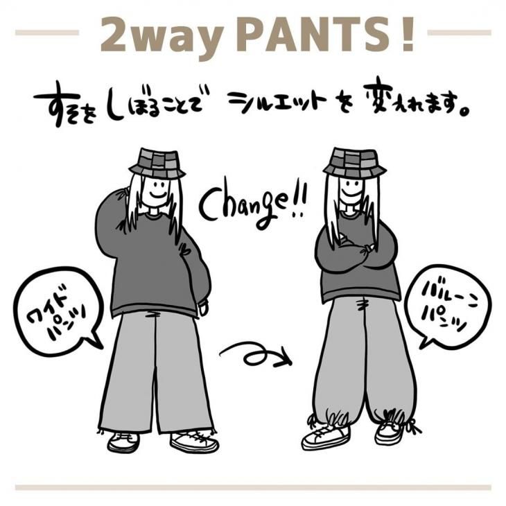 裾の紐を絞れば、バルーンパンツにもなる2way仕様。